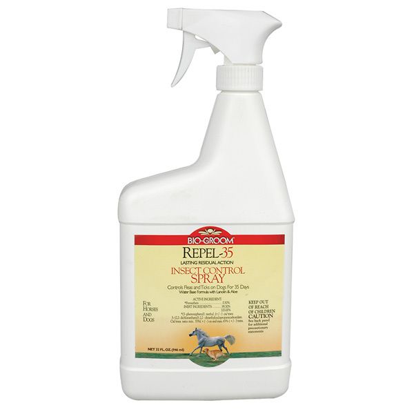 Brush animal thoroughly to remove loose dirt and dust. This dog flea and tick treatment is also safe to use on horses. Bio Groom Repel-35 Insect Control Spray 16 Oz. Bio-Groom Repel-35 controls fleas and ticks on dogs for 35 days. If youre looking for a DEET-free alternative to create a mosquito barrier then oil of lemon eucalyptus is a great option. Brush animal thoroughly to remove loose dirt and dust or bathe the animal with Bio-Groom Golden Sheen Conditioning Shampoo. Bio-Groom 08032 Repel 35 Residual Action Insect Control Spray 32 oz.