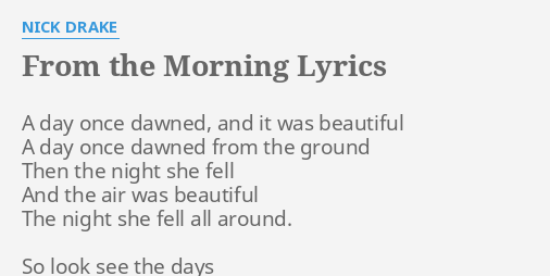 We have another 1 lyrics of songs by J. FROM THE MORNING- Nick Drake TUNING. Baby you summertime fine I let you get on top I be the underline Im tryna get beside you Like the number nine dime. And now we rise from the ground. In the Morning Lyrics. And now we rise and we are everywhere. In the Morning Lyrics Drake.